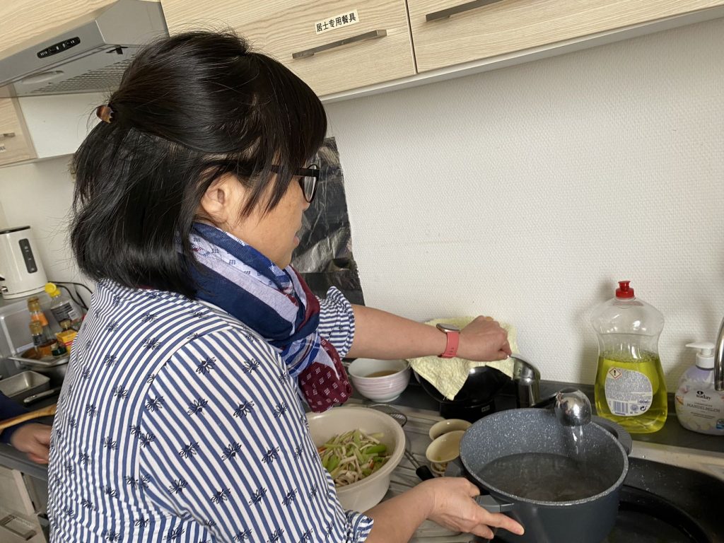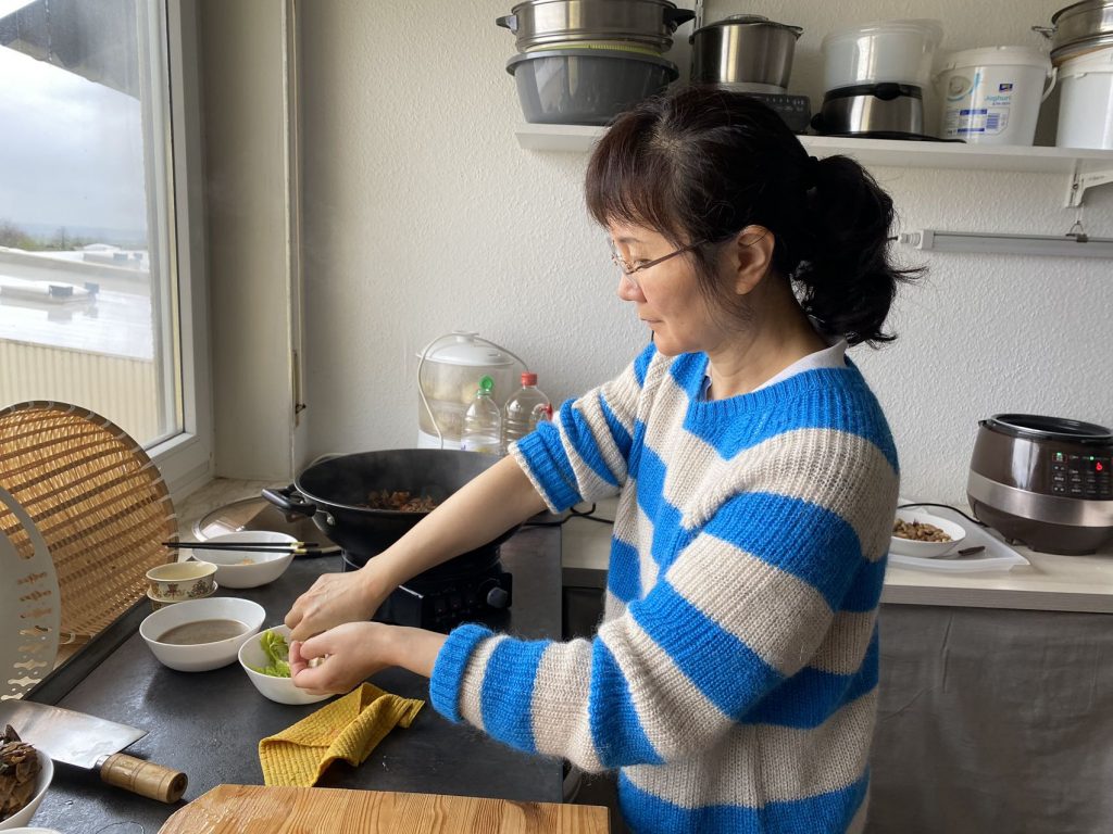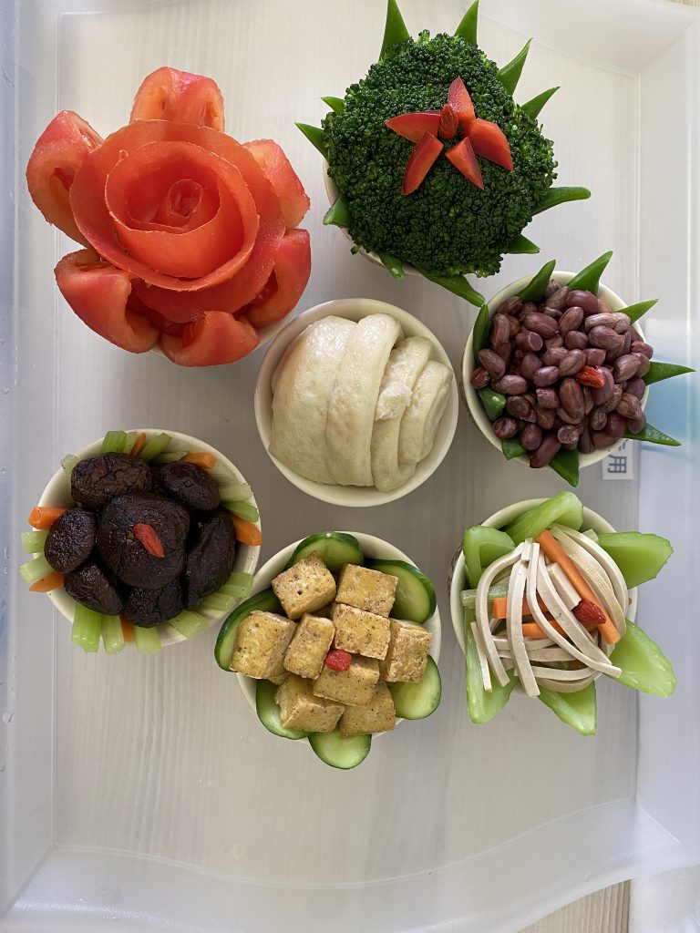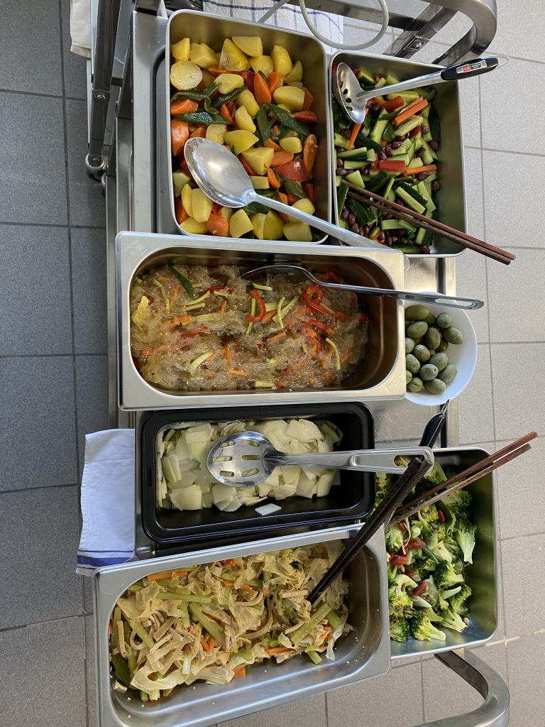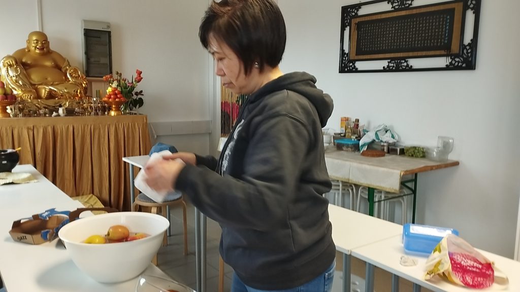 众缘和合的供菜。食材来之不同的国家,多位不同的佛子发心供养,法师和三位同学们一起制作。