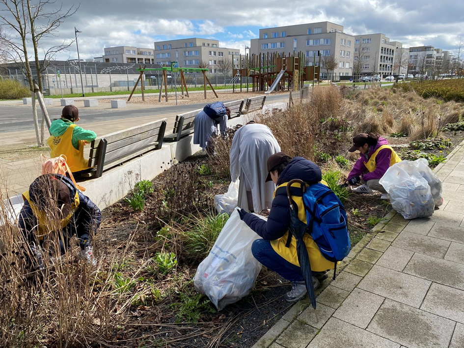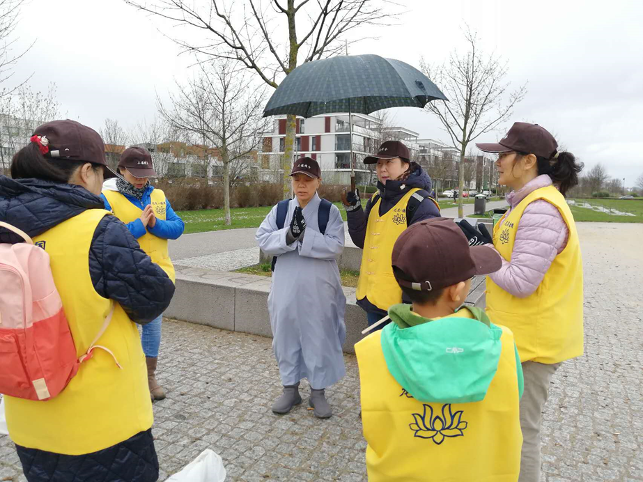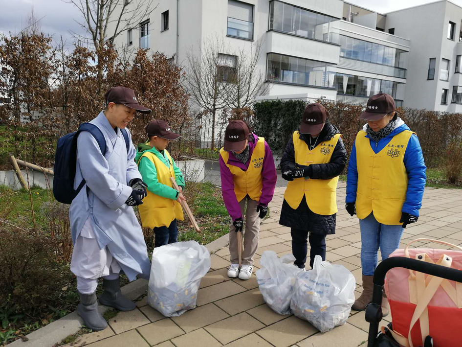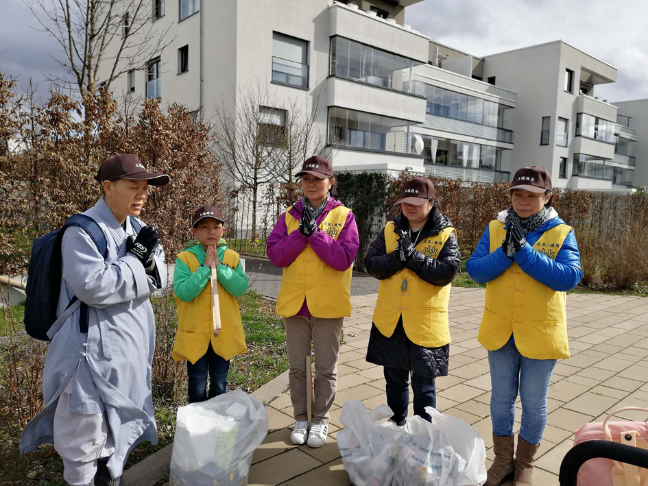 为参与第五届法兰克福全民大扫除,即春季清洁活动,融入本土,服务社会,3月16日星期六11:00一13:00在Riedberg社区,三德精舍组织僧俗二众共7人参加了本季度的社区清洁活动,共造殊胜善业,广结善缘。